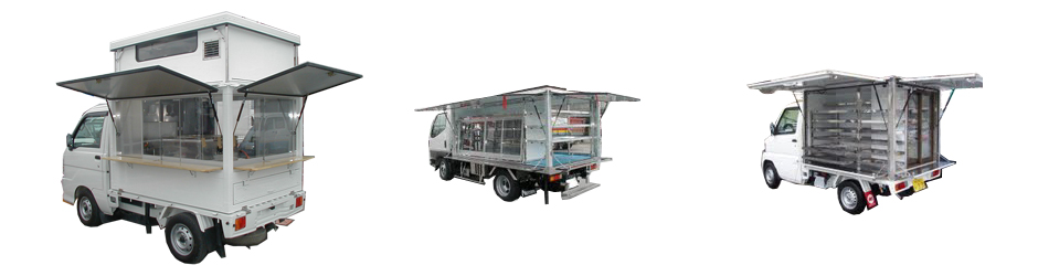 | 軽ルーフアップ型調理販売車 | 生鮮三品食品移動販売車 | パン&ケーキ移動販売車 |